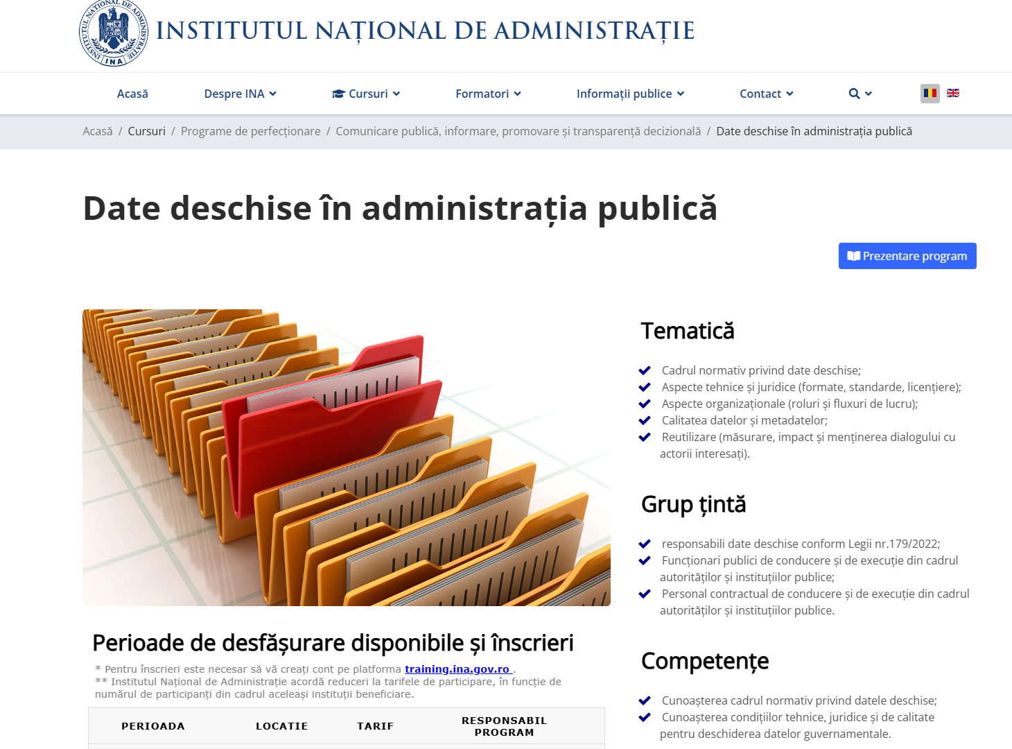 În acest context, INA continuă să asigure disponibilitatea cursului Date deschise în administrația publică. Regăsiți mai multe detalii despre perioadele de desfășurare și condițiile de participare și înscriere: https://ina.gov.ro/cursuri/programe-de-perfectionare/comunicare-publica-informare-promovare-si-transparenta-decizionala/date-deschise-in-administratia-publica